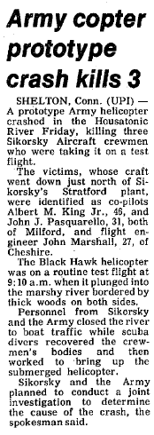 Prototype Black Hawk crashed in the Housatonic River at approx. 0910 hours while on a test flight for Sikorsky due to a maintenance error that caused the stabilator amplifier to