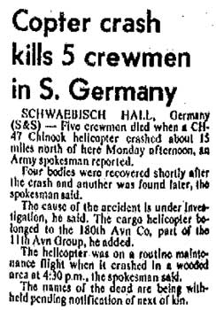 A/C exploded and broke in two parts while on training flight from Regensburg to Grafenwoehr and crashed near Pegnitz at 0945 hrs. Fatigue failure of the rotor blade led to its failure and structural failure of the A/C. PAX's were members of HHC 2-4 INF. |