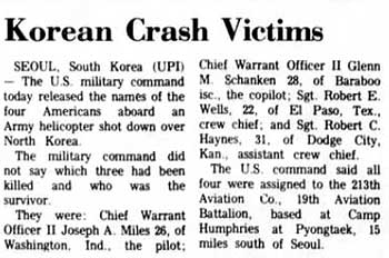 Shot down by North Korean ground fire after it tried to take off after mistaking the first ground fire for engine trouble and putting down to check it out. A/C accidentally crossed DMZ. |