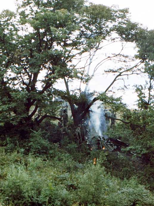 A/C hit by machinegun fire, crashed and burned behind enemy lines, no chutes observed. |
