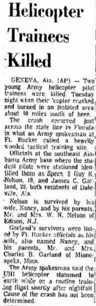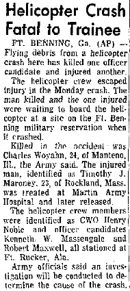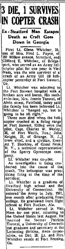 A/C from Ft Benning crashed and burned while firing machine guns on Ft Stewart's Metz range. *1LT Whitcher died of injuries on 07MAR64. |