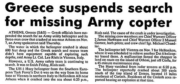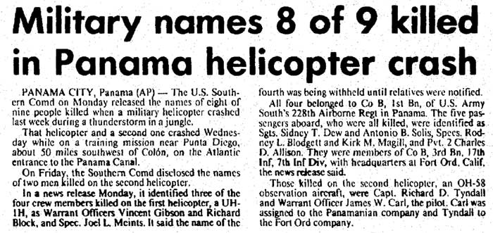 Shot down by an FMLN patrol in San Francisco canton at approx 1430 hours in Lolotique district, Department of San Miguel, while flying at low altitude. Crew successfully autorotated down the side of a hill after crossing a ridgeline. A/C crashed into a 4 foot boulder, and then rotated 185 degrees around it. CW4 Daniel Scott was killed instantly as his side of the A/C struck the boulder. Dawson and Pickett were executed by FMLN. |