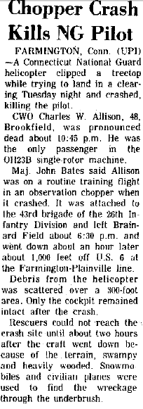 A/C nose dived into a swampy forest clearing about 300 yds off Route 6 behind the Stanley Works plant at approx 1930 hours near the Farmington-Plainville town line. |